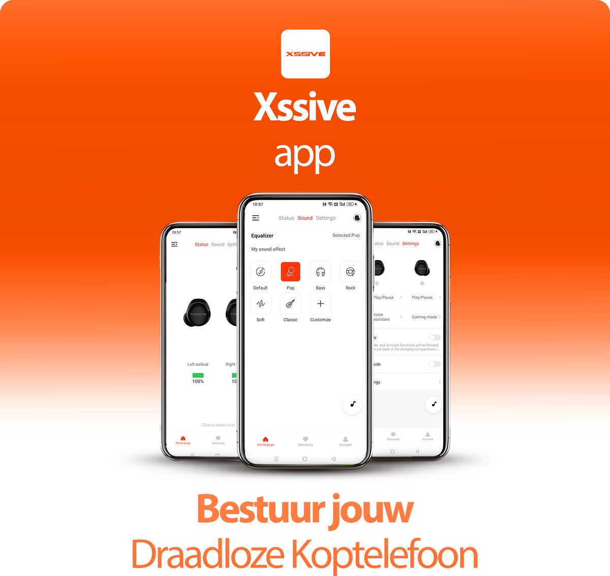 Pas je audio naar wens aan met de gratis Xssive app, die compatibel is met iOS, Android, iPadOS en Windows. Stel bijvoorbeeld EQ-instellingen in voor Pop, Rock, Bass of Soft muziek, of bouw een eigen profiel. Bedien functies zoals touchbediening en microfoonsnelkoppelingen en maak je ervaring persoonlijk.