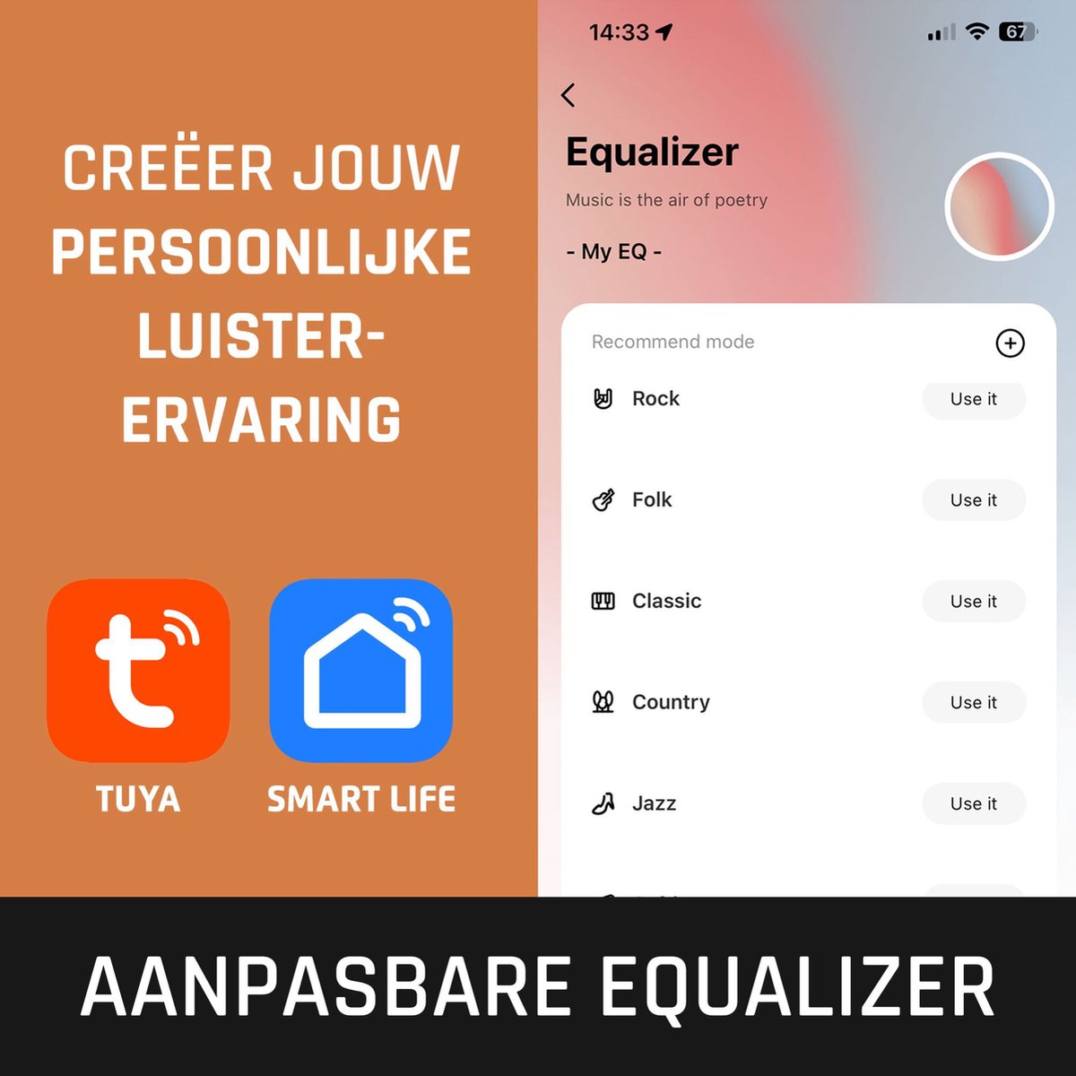 Pas je geluid precies naar wens aan met de geïntegreerde Equalizerfunctie, te bedienen via de Tuya of Smart Life app. Na een uitgebreide gehoortest stel je de audioprofielen volledig af op jouw luisterstijl, zodat je elk nummer perfect kunt afstemmen met je persoonlijke geluidsprofiel. Zo creëer je een unieke luisterervaring die helemaal bij jou past.