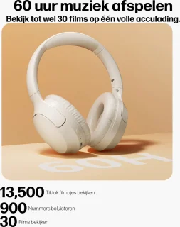 Zeg vaarwel tegen constante oplaadbeurten. Met maximaal 60 uur speeltijd op één lading beluister je muziek en podcasts de hele week door. En is de batterij toch leeg? Met 15 minuten snelladen via USB‑C heb je al zo’n 4 uur extra muziek beschikbaar.